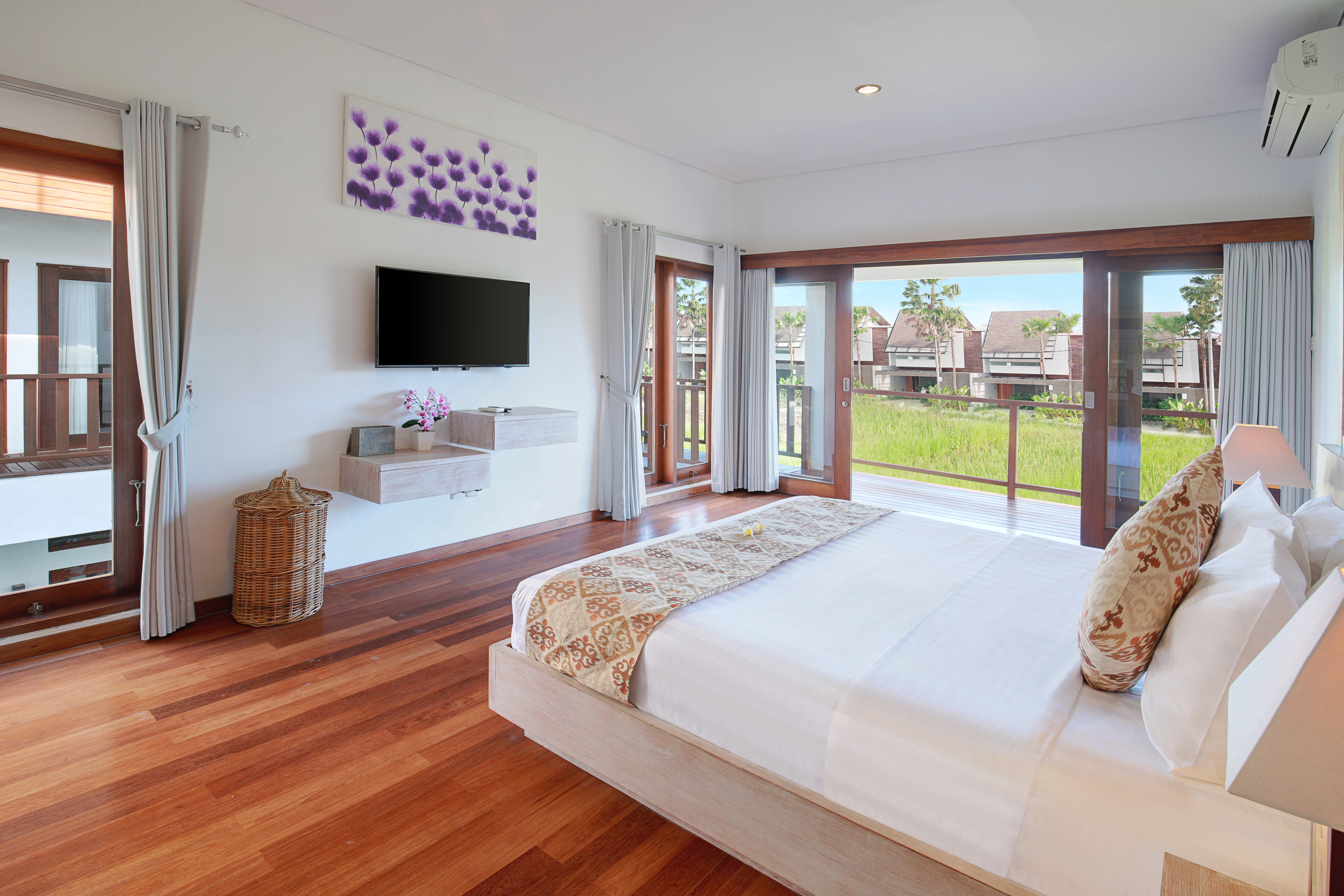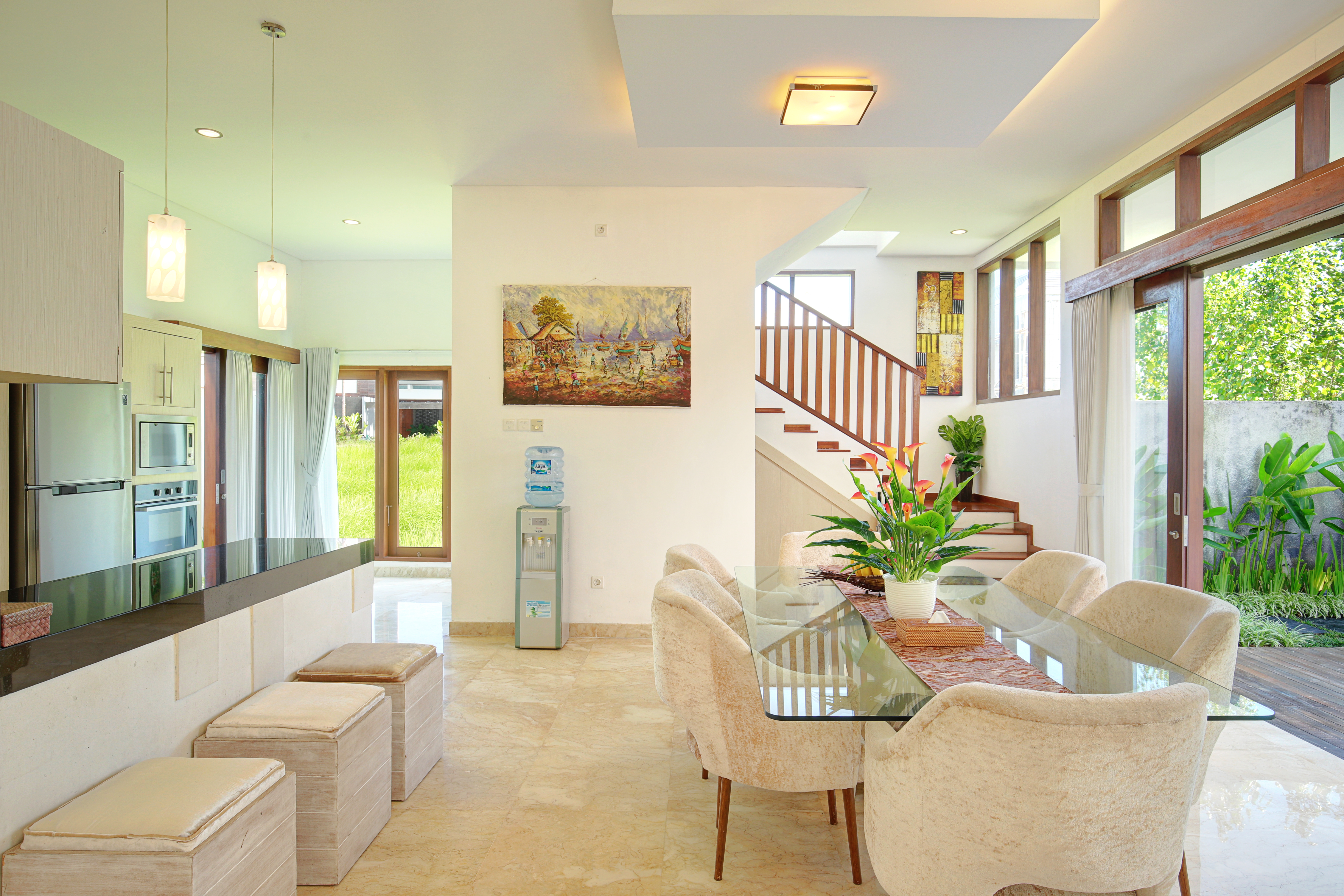 На вилле с шикарным видом на рисовые поля есть всё необходимое для комфортного отдыха - бассейн, бильярд, холодильник, духовка и варочная поверхность, СВЧ, эл.чайник, тостер, мультиварка, миксер, стиральная машина, ЖК телевизоры и кондиционеры, во всех комнатах и свои террасы у каждой, музыкальная станция, фены, утюг, Wi-Fi